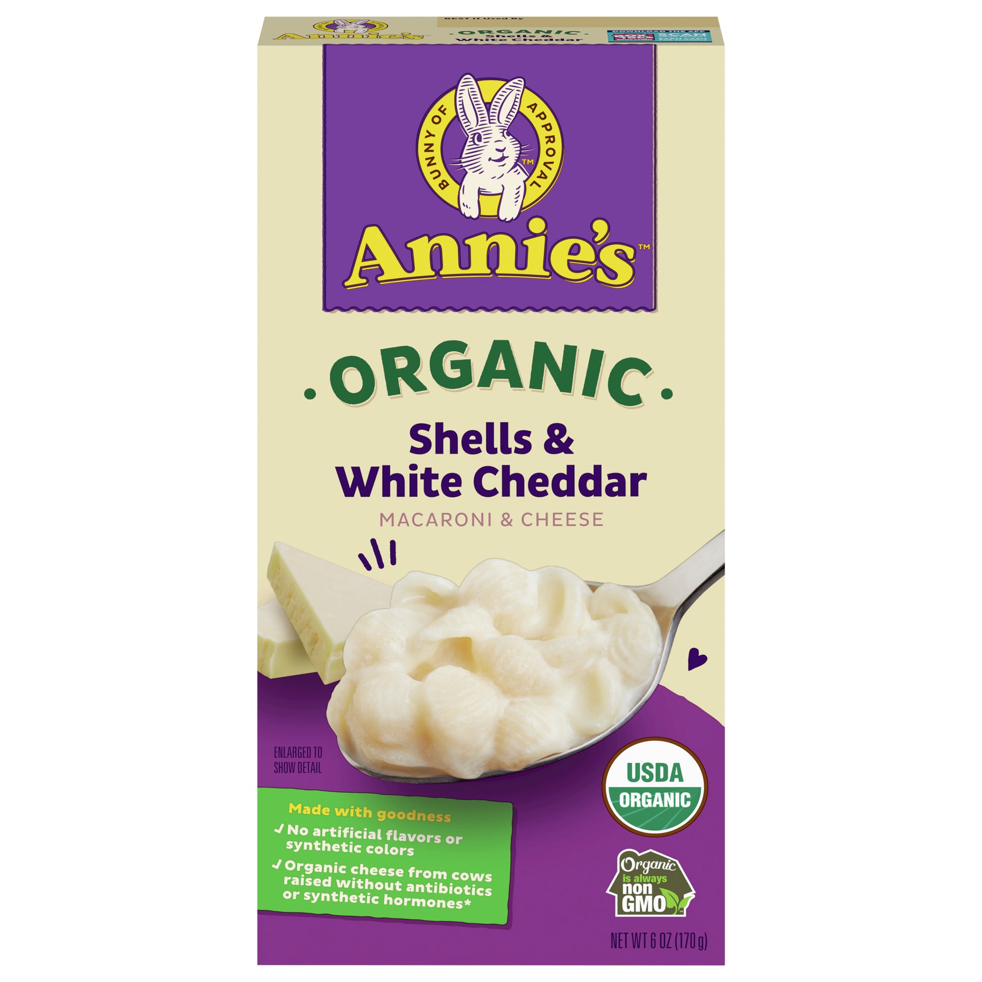 Annie’s White Cheddar Organic Mac and Cheese delivers the creamy, cheesy yumminess that will get the whole family hopping to the table. Made with shell-shaped organic pasta and real organic cheese, Annie's organic white cheddar macaroni and cheese is a wholesome kids dinner option crafted with lots of care you can taste in every spoonful. Annie's mac and cheese offers quality ingredients in every box, containing organic cheese from cows raised without antibiotics or synthetic hormones*. This tasty, USDA Certified Organic macaroni and cheese is made with no artificial flavors or synthetic colors, helping you introduce more organic food into your family's diet while offering the classic comfort food taste you know and love. Enjoy the rich combination of organic pasta shells and cheese in Annie's macaroni and cheese for lunchtime, dinnertime or anytime you're in the mood for something downright delicious. Annie's mac and cheese is ready in just ten minutes, helping you spend less time cooking so you can delight in all the goodness of a wholesome family meal option. Simply boil the shell pasta in water and drain it in a colander. Heat three tablespoons of lowfat milk in a medium saucepan and mix in the cheese packet. Then, add the cooked pasta to the saucepan and stir well to combine. Serve Annie's mac n cheese as a side dish, pair it with veggies and chicken nuggets, or use it to prepare baked bacon mac and cheese. This six-ounce box is easy to store in the pantry and contains two servings for a quick kids mac and cheese dinner option. Annie’s macaroni and cheese dinner is an official Box Tops For Education participating product. Download the Box Tops App to learn more and start earning cash for schools in need today. Annie’s Homegrown is devoted to spreading goodness through kindness to the planet and creating tasty foods for everybunny.