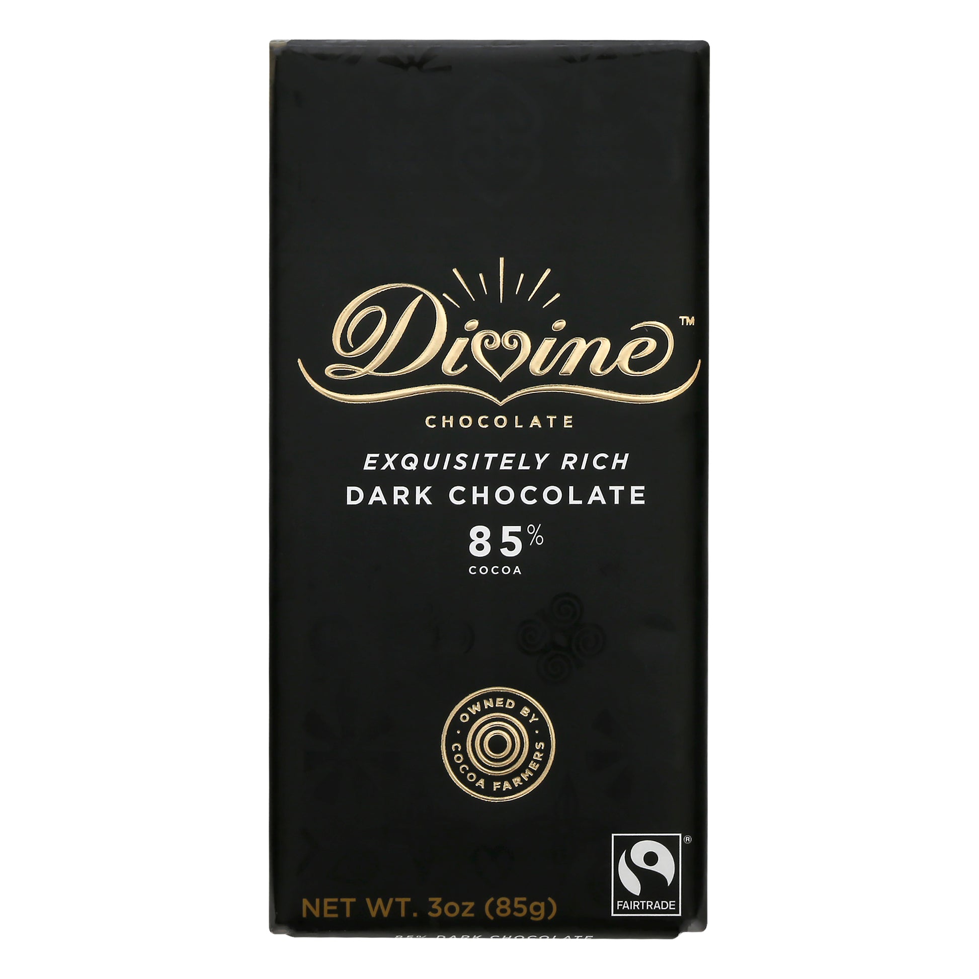 An especially smooth dark chocolate, rich with exceptional cocoa flavor. No artificial flavors. Vegan. Non GMO Project verified. nongmoproject.org. Exquisitely rich. 85% Cocoa. Adinkra symbols - find out their meanings inside. Discover more about Divine. Look inside! Seriously Good Chocolate: natural ingredients; 100% pure cocoa butter; no palm oil or soy. divinechocolate.com. (hashtag)TasteDivine. Discover more at: divinechocolate.com. Certified B Corporation. Owned by Cocoa Farmers: At divine, the cocoa farmers who grow the finest quality cocoa for the chocolate also own 44% of the company and share in the profits. Fairtrade. Fairtrade cocoa grown by family farmers in Ghana. Cocoa solids 85% minimum in chocolate. Sugar, cocoa, vanilla: traded in compliance with Fairtrade Standards, total 99% of the product's ingredients. Visit www.info.fairtrade.net. Product of Germany.