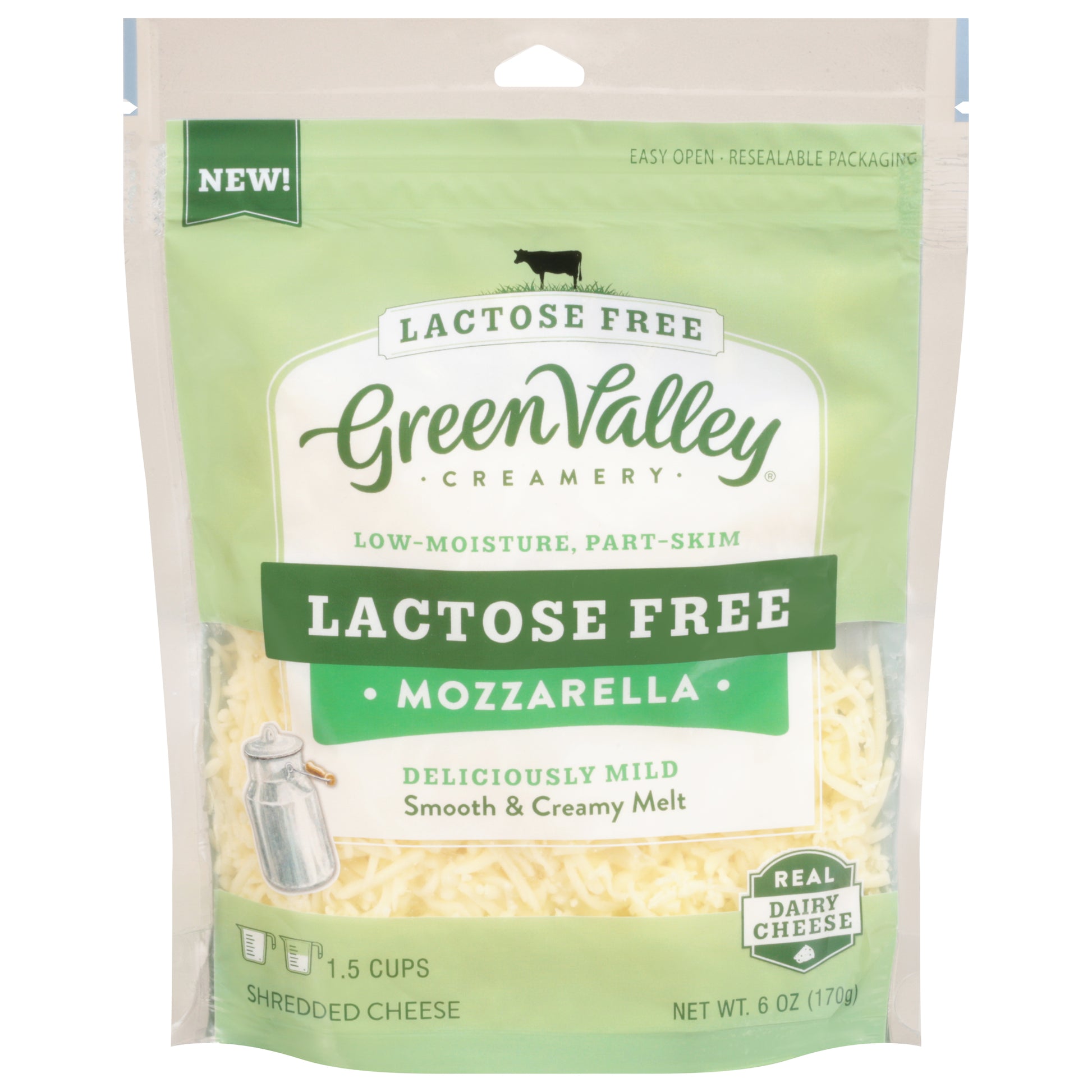 Good source of protein. Good source of calcium. No lactose, ever. New. Easy open. Delicious mild. Smooth & creamy melt. When was the last time you feasted on pizza without worrying? Or dug into lasagna without a smidgen of discomfort? Well, tada! The time has come. This cheese is totally lactose free and the real deal. Perfectly stretchy, melty, bubbly mozzarella. How do we make it lactose free? Our products are made from real dairy milk. To make them lactose free, we add an enzyme called lactase that breaks down the lactose into two digestible sugars. If you don't have enough lactase enzymes to digest lactose and this can be really uncomfortable. So, we do this little step for you and we're real sticklers about making sure it's done right. We test every batch to ensure it is actually lactose free, according to our strict standards. No rBST (The FDA has determined there are no significant differences between milk from rBST treated cows and non-rBST treated cows). A bag full of yummm!