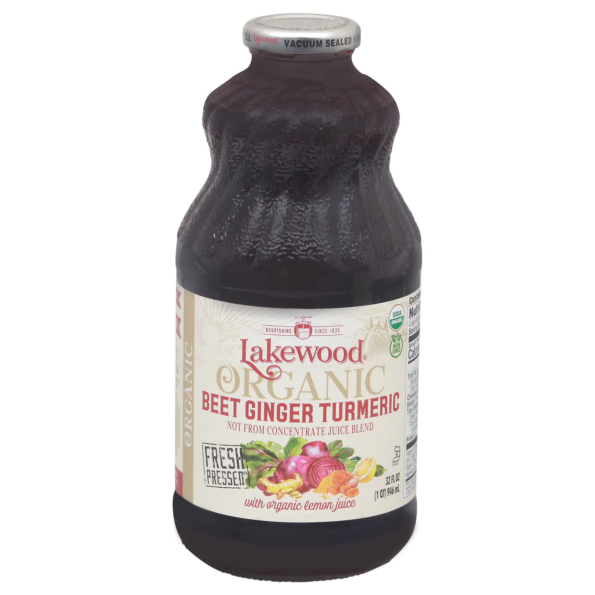 Beet ginger turmeric with organic lemon juice. USDA Organic. 100% Vegan. Gluten free. Allergen free per FDA 8 major food allergens. Casein free. Certified Organic by Quality Assurance International (QAI). Non GMO. Nourishing since 1935. Not from concentrate juice blend. Fresh pressed. Pasteurized juice made from fresh beets. What's in the Bottle: 3 lbs. Organic beets with lemon, ginger and turmeric. Trusted family brand since 1935. Unsweetened. Feel good. Live good. No preservatives. www.lakewoodorganic.com. Facebook. Instagram. Pinterest. All glass BPA/BPS/DEHP free. Glass recycles.