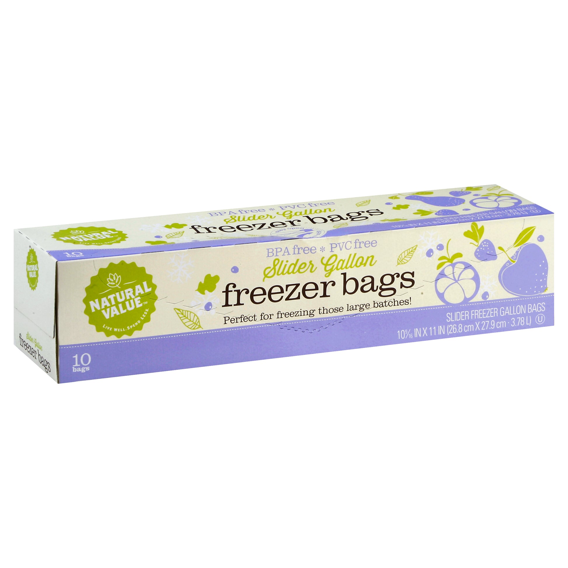 3.78 lt. 10-9/16 in x 11 in (26.8 cm x 27.9 cm). BPA free. PVC free. Perfect for freezing those large batches! Live well. Spend less. Our Natural Value Slider Gallon Freezer Bags are free of BPA, PVC, and plasticizers. They are also made of polyethylene, and are packaged in materials made from 100% recycled paperboard. We started Natural Value in 1995 with 25 products and one compelling mission: To make natural and organic foods and environmentally friendly household products more affordable. www.naturalvalue.com. SFI: Certified sourcing. www.sfiprogram.org. Please recycle this packaging. Made of polyethylene - BPA has never been used to make polyethylene. Made in the USA of US and Canadian resin.