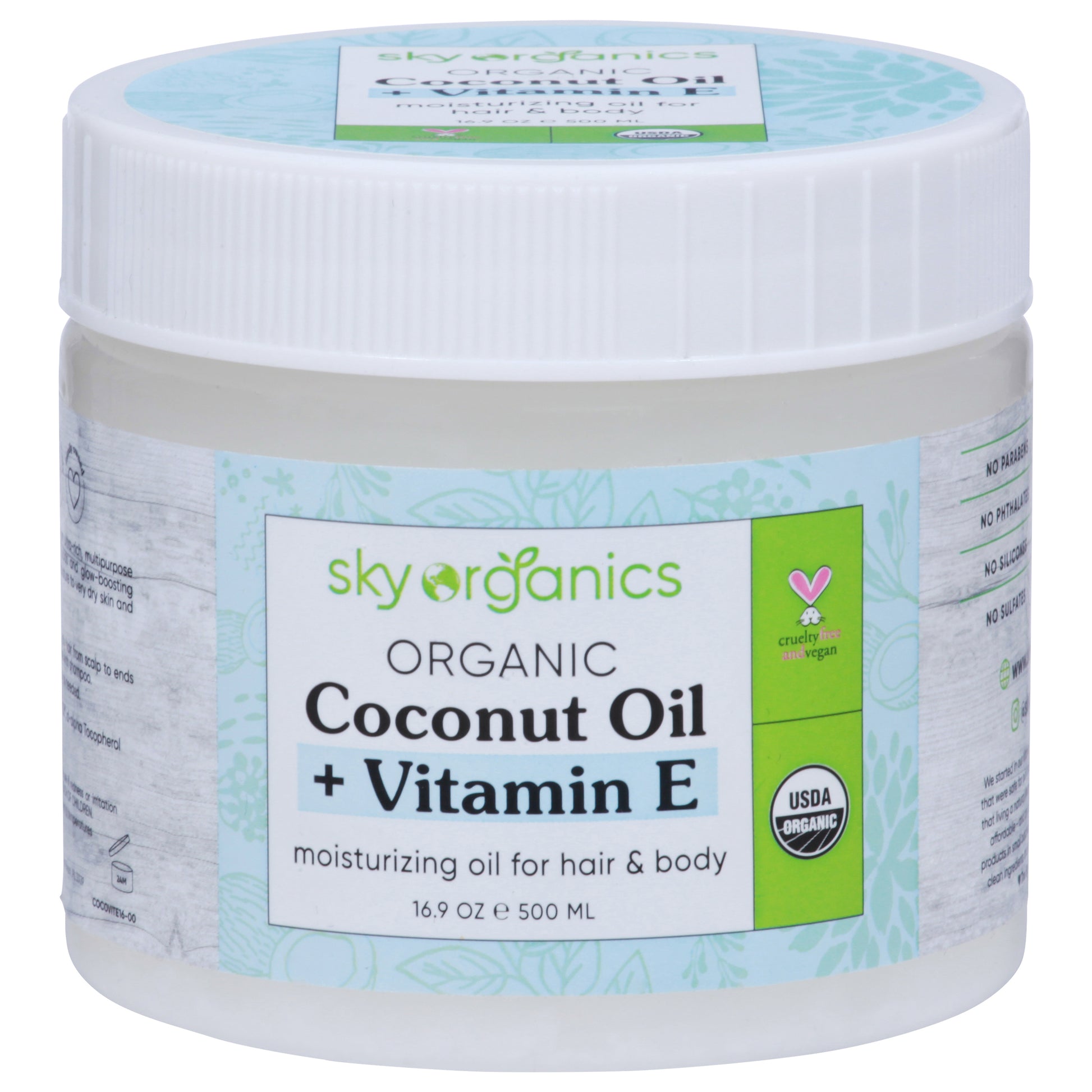 Moisturizing oil for hair & body. Safe ingredients. Green & growing. Responsibly made. Family owned. Our Organic Coconut Oil + Vitamin E is an ultra-rich, multipurpose beauty staple full of nourishing fatty acids and glow-boosting antioxidants that help provide intense moisture to very dry skin and hair in need of love and hydration. No parabens. No phthalates. No silicones. No sulfates. No mineral oil. No petrolatum. No dyes. We started in our kitchen - creating everyday essentials that were safe for our growing family. Soon we discovered that living a natural lifestyle could be easy, beautiful, and affordable - and are still proving it today by making products in small batches, responsibly sourced, clean ingredients that are kind to you and the planet. - The Sky Organics Family. Cruelty-free and vegan.